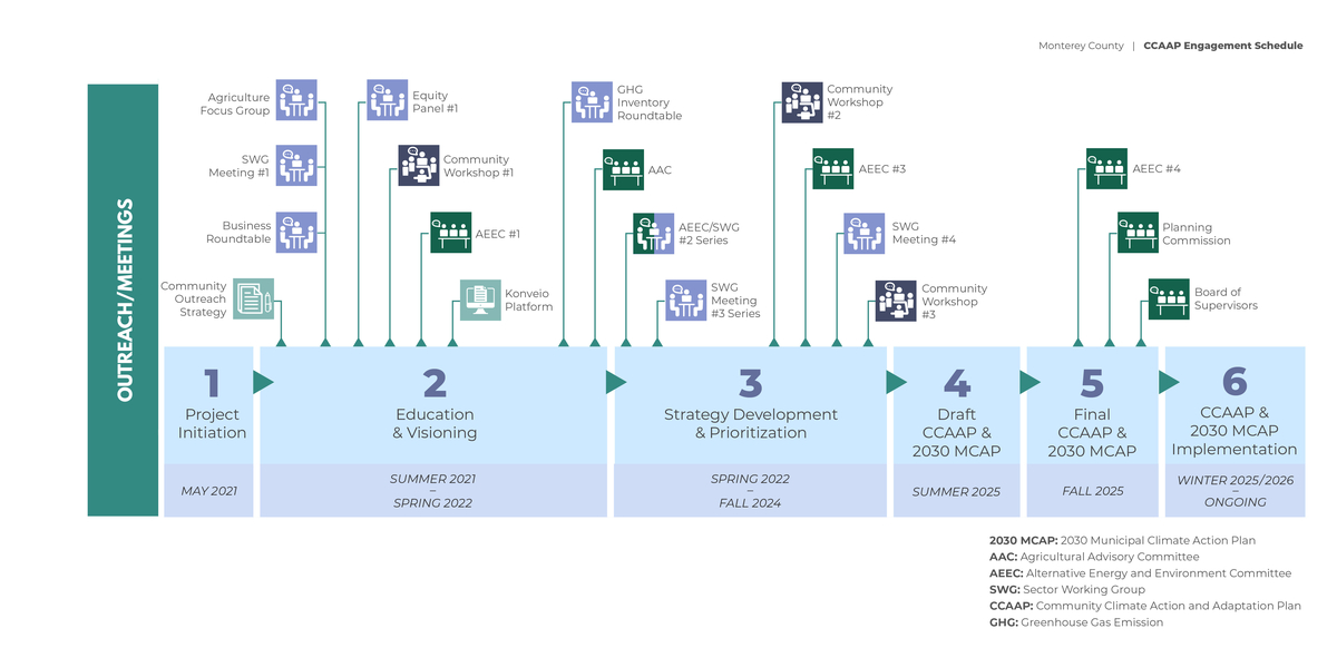 The County of Monterey (County) is embarking on an effort to develop its Community Climate Action and Adaptation Plan (CCAAP) for 2030 to reduce greenhouse gas emissions in line with the targets set by the State of California. The CCAAP is identified by the County’s 2010 General Plan as a mitigation measure in the Final Environmental Impact Report and is intended to be an opportunity for robust stakeholder engagement amongst the various sectors of the county to select strategies that are the most cost-effective and beneficial for the County in meeting its emissions reduction targets.